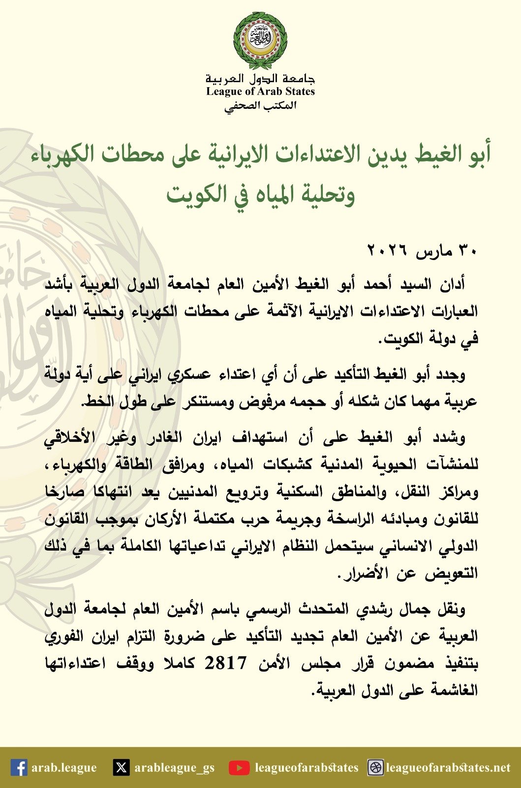 أبو الغيط يدين الاعتداءات الايرانية على محطات الكهرباء وتحلية المياه في الكويت