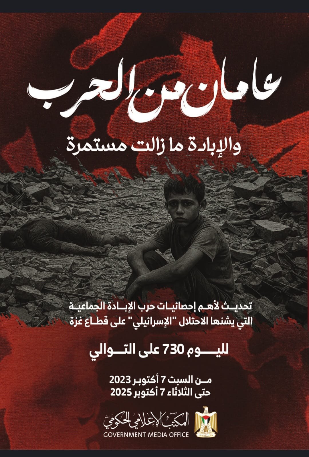 ♦️ *المكتب الإعلامي الحكومي ينشر تحديثاً لأهم إحصائيات الإبادة الجماعية التي يرتكبها الاحتلال “الإسرائيلي” في قطاع غزة بمناسبة مرور عامين كاملين (730 يوماً على الإبادة)، من السبت 7 أكتوبر 2023 حتى الأحد 5 أكتوبر 2025:*