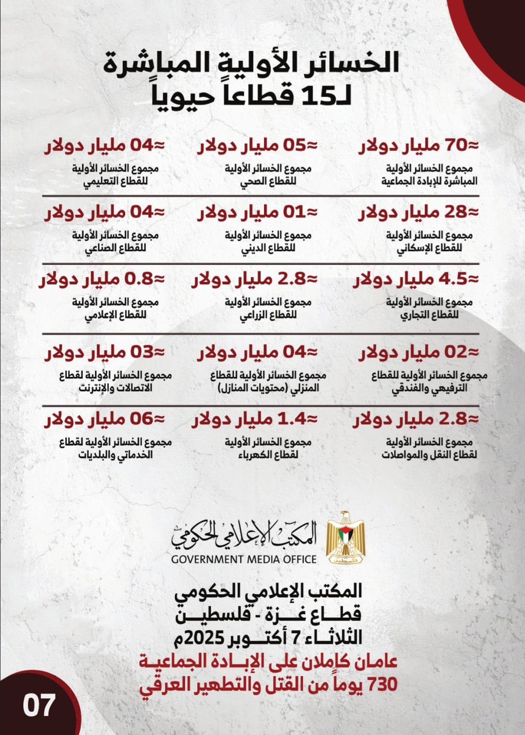 🔸(70) مليار دولار مجموع الخسائر الأولية المباشرة للإبادة الجماعية.