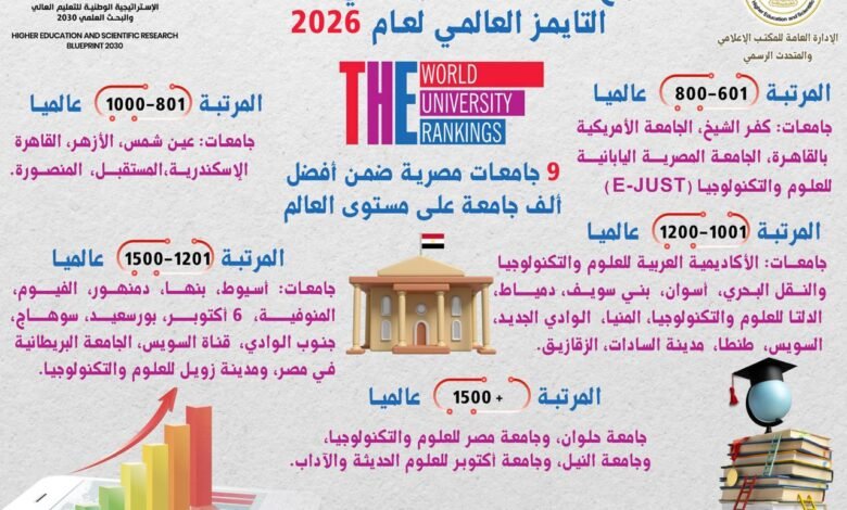 ومن جانبه، أوضح الدكتور عادل عبد الغفار، المستشار الإعلامي والمتحدث الرسمي للوزارة، أن تقدم الجامعات المصرية في تصنيف التايمز لعام 2026 يعكس التطور المستمر في الأداء الأكاديمي والبحثي ويترجم الجهود المبذولة من قبل الجامعات المصرية، مؤكدًا أن سياسة الوزارة في دعم ملف التصنيفات الدولية والمتابعة الدقيقة للمعايير العالمية بالتعاون مع الجامعات المصرية كان لها أثر مباشر في تحقيق هذا التقدم الملموس.