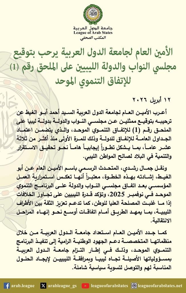 الأمين العام لجامعة الدول العربية يرحب بتوقيع مجلسي النواب والدولة الليبيين على الملحق رقم (1) للإتفاق التنموي الموحد