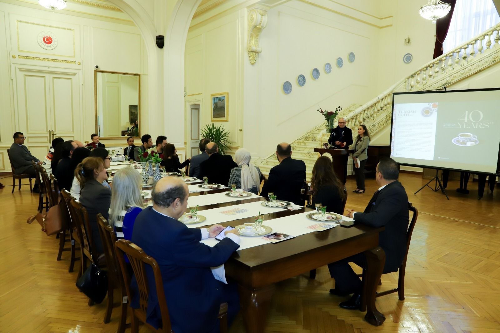 قُدّمت القهوة التركية وحلوى “الملبن التركية”، وأنواع مُختلفة من الحلويات للضيوف، كما تم تقديم عرضٌ مُرفقٌ بمقاطع فيديو وصور، حول تاريخ القهوة التركية وطريقة تحضيرها ومكانتها في الثقافة التركية.