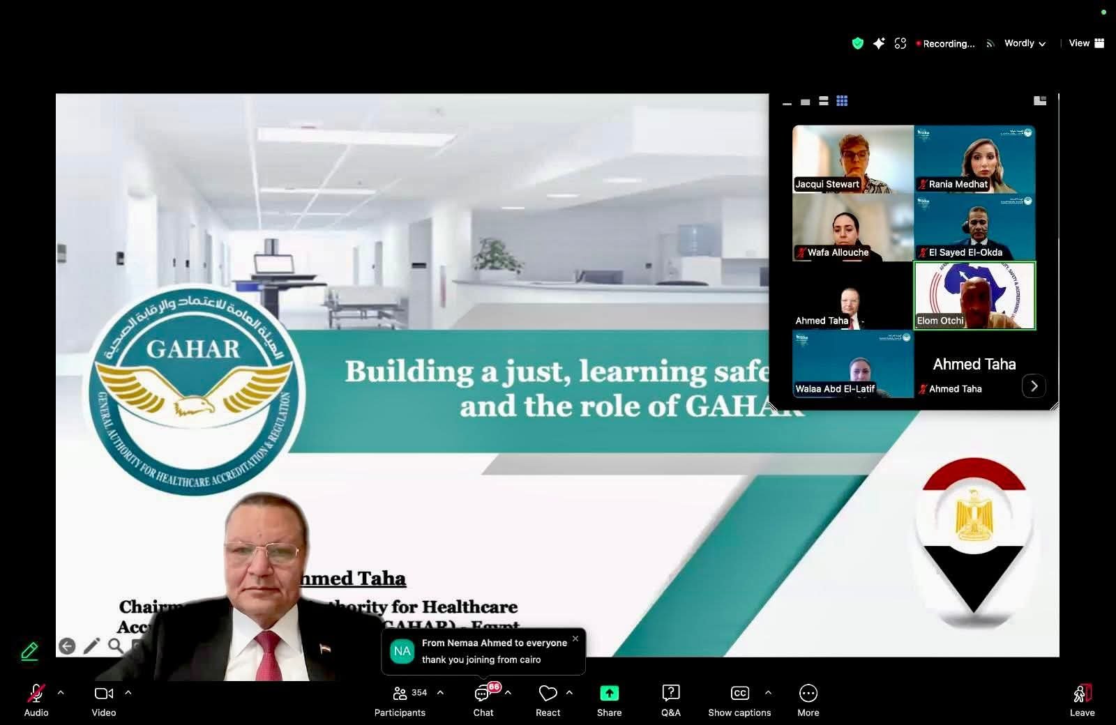نظّمت الهيئة العامة للاعتماد والرقابة الصحية (GAHAR) ويبنار دولي بالتعاون مع المنظمة الدولية لجودة الرعاية الصحية (ISQua) ومنظمة Africa Community of Practice لاستعراض أبرز ملامح التجربة المصرية في ترسيخ ثقافة سلامة المرضى، وتعزيز مفاهيم الجودة المستدامة داخل مؤسسات الرعاية الصحية.