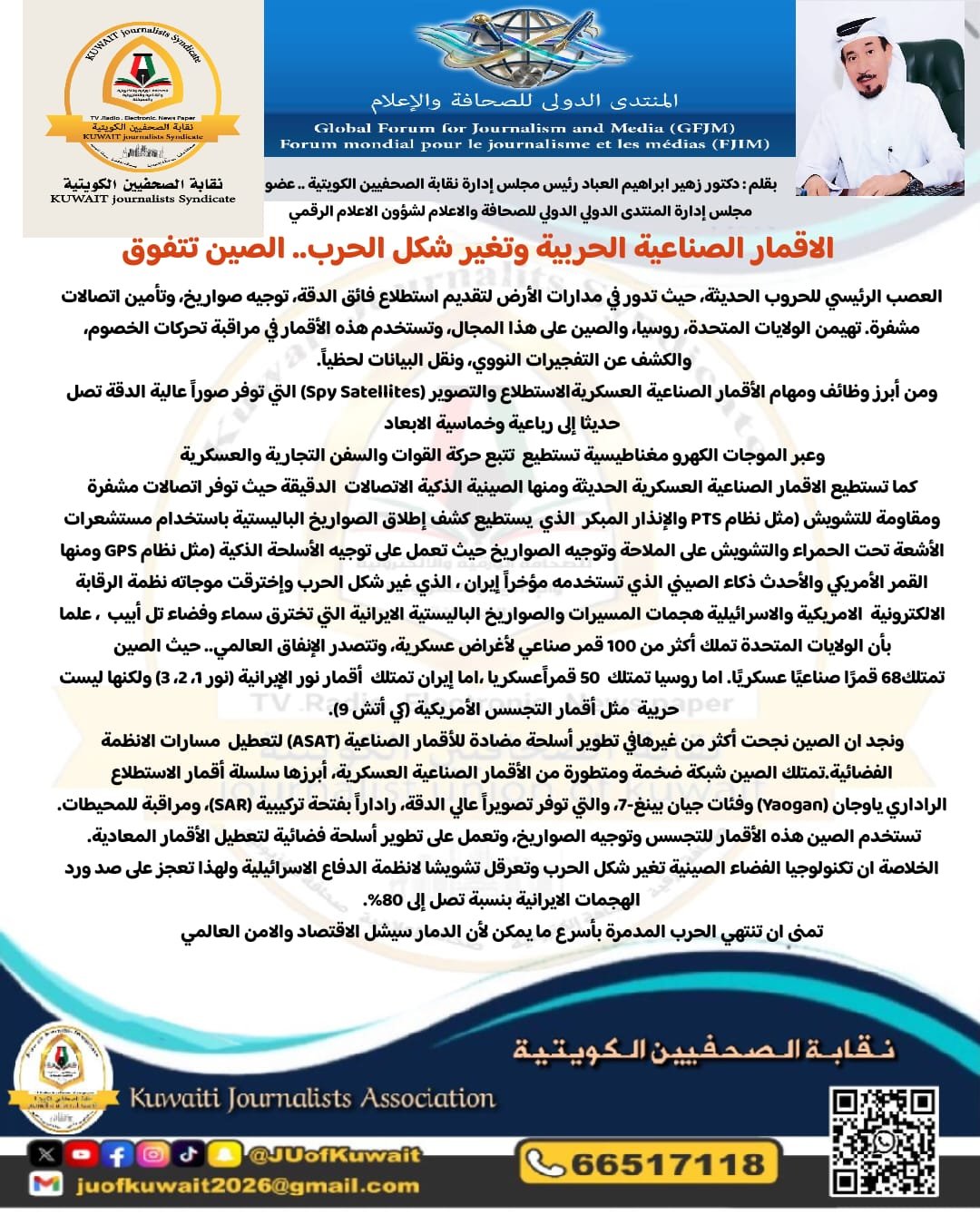 ونجد ان الصين نجحت أكثر من غيرها في تطوير أسلحة مضادة للأقمار الصناعية (ASAT) لتعطيل مسارات الانظمة الفضائية. تمتلك الصين شبكة ضخمة ومتطورة من الأقمار الصناعية العسكرية، أبرزها سلسلة أقمار الاستطلاع الراداري ياوجان (Vaogan) وفئات جيان بينغ – 7، والتي توفر تصويراً عالي الدقة، راداراً بفتحة تركيبية (SAR)، ومراقبة للمحيطات. تستخدم الصين هذه الأقمار للتجسس وتوجيه الصواريخ، وتعمل على تطوير أسلحة فضائية لتعطيل الأقمار المعادية. الخلاصة ان تكنولوجيا الفضاء الصينية تغير شكل الحرب وتعرقل تشويشا لانظمة الدفاع الاسرائيلية ولهذا تعجز على صد ورد الهجمات الايرانية بنسبة تصل إلى 80%.