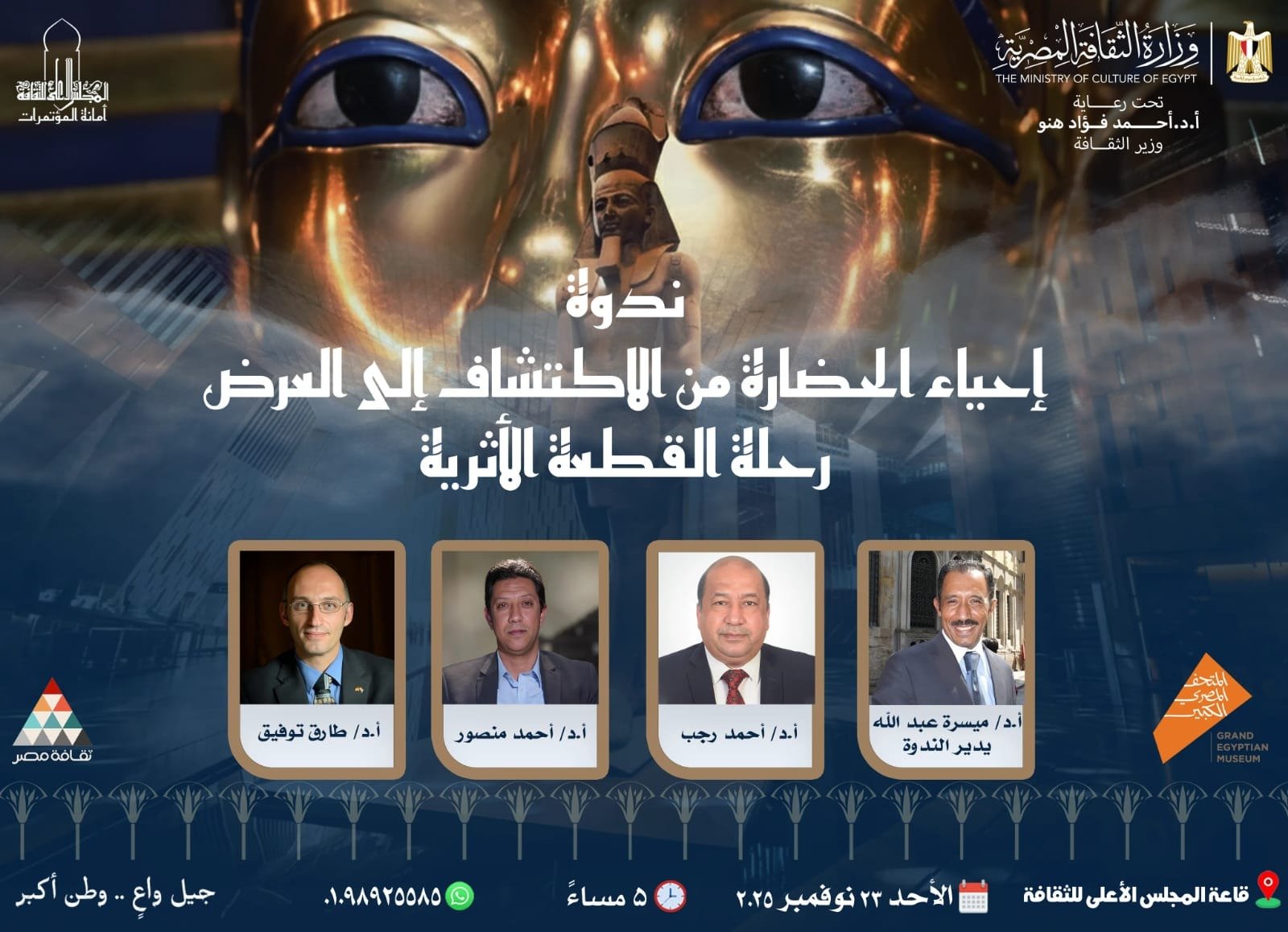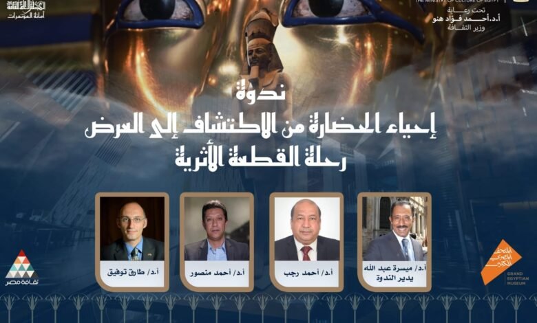 في تمام الساعة الخامسة مساء يوم الأحد الموافق 23 نوفمبر 2025، ينظم المجلس الأعلى للثقافة ندوة بعنوان “إحياء الحضارة من الاكتشاف إلى العرض… رحلة القطعة الأثرية”، وذلك في إطار احتفاء وزارة الثقافة المصرية بافتتاح المتحف المصري الكبير، وضمن فعاليات مبادرة “فرحانين بالمتحف الكبير… ولسه متاحف مصر كتير” التي تُطلقها الوزارة برعاية الدكتور أحمد فؤاد هنو وزير الثقافة.