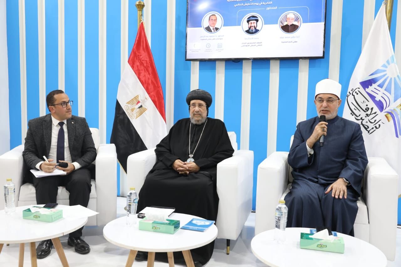 تزامنًا مع الاحتفال باليوم العالمي للتعايش .. مفتي الجمهورية والأنبا إرميا يستعرضان عبقرية الأنموذج المصري في التعايش الإنساني والتعددية الفكرية في جناح دار الإفتاء بمعرض الكتاب