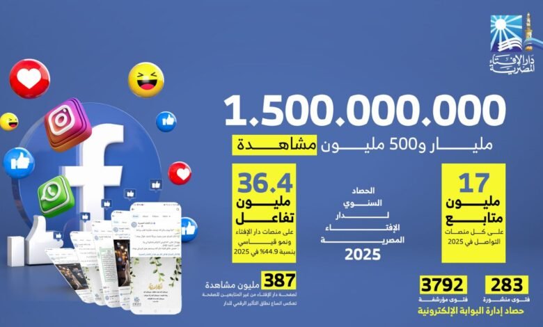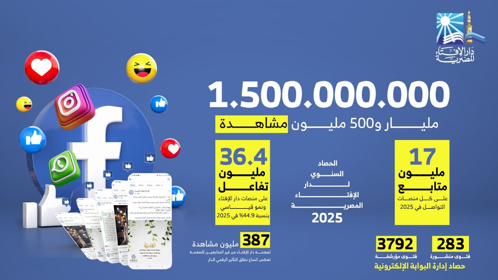 وشهدت المنصات الرقْمية لدار الإفتاء المصرية خلال عام 2025 تفاعلًا واسعًا من جانب الجمهور، حيث سجلت الصفحة الرسمية على «فيسبوك» نحو مليار ونصف المليار مشاهدة، من بينها أكثر من مليار مشاهدة من المتابعين، وأكثر من 415 مليون مشاهدة من غير المتابعين؛ ما يعكس قدرة المحتوى الإفتائي والتوعوي على الوصول إلى شرائح جديدة من الجمهور داخل مصر وخارجها، إلى جانب تسجيل 38.4 مليون زيارة خارجية، بنسبة نمو تجاوزت 77٪.