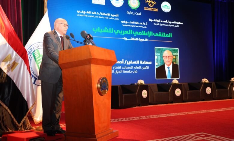 رئيس قطاع الإعلام والاتصال بجامعة الدول العربية كلمة أثناء الجلسة الافتتاحية للملتقى الإعلامي العربي للشباب الدورة 10 بمدينة 6 أكتوبر يوم السبت 14- فبراير – 2026، رحب فى بدايتها بكل من:- الدكتور خالد الطوخي – رئيس مجلس أمناء جامعة مصر للعلوم والتكنولوجيا، “ماضي الخميس ” الأمين العام للملتقى الإعلامي العربي، الدكتورة هالة المنوفي – رئيس جامعة مصر للعلوم والتكنولوجيا، الدكتورة أماني الحسيني – عميد كلية الإعلام وتكنولوجيا الاتصال والعمداء والأستاذة الأجلاء والحضور الكريم، والطلاب الاعزاء.