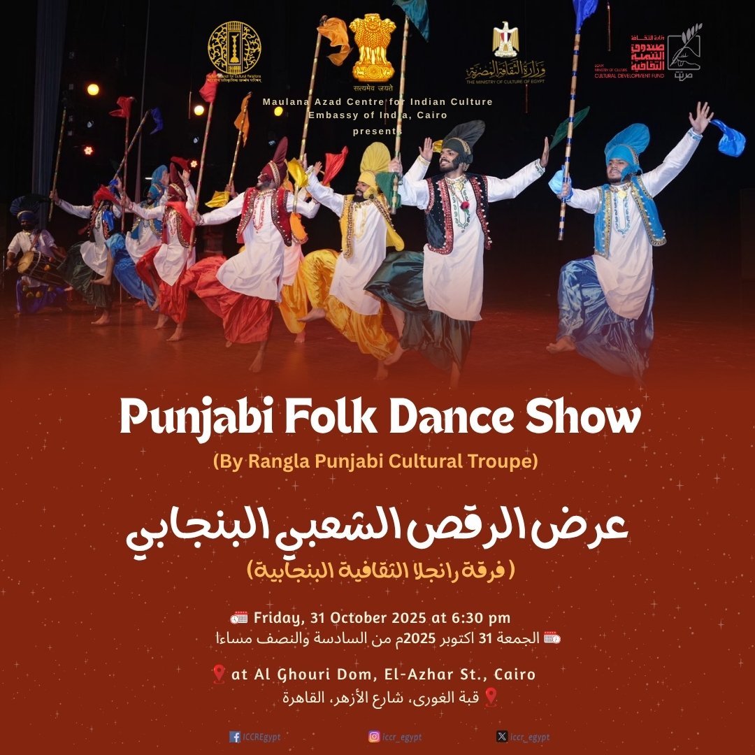 يسرّ سفارة الهند بالقاهرة أن تعلن عن إقامة عرض مميز للرقص الشعبي البنجابي في قصر قبة الغوري التاريخي بالقاهرة، وذلك يوم 31 أكتوبر 2025، الساعة 6:30 مساءً.