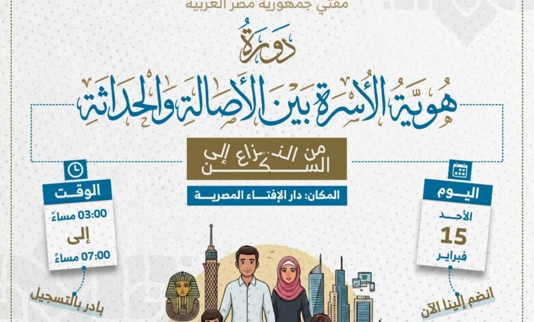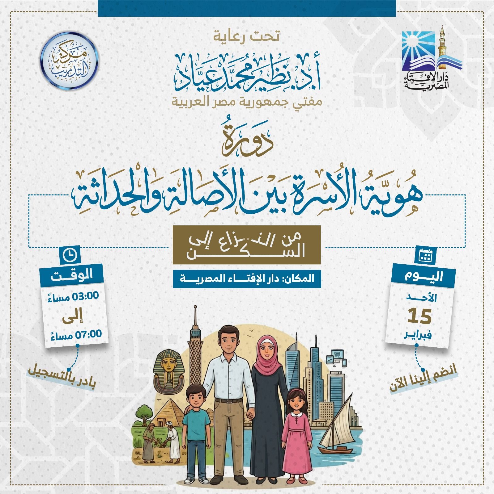 تحت رعاية أ.د.نظير محمد عيَّاد، مفتي الجمهورية، رئيس الأمانة العامة لدُور وهيئات الإفتاء في العالم، تنظِّم دار الإفتاء المصرية دَورة تدريبية متخصصة بعنوان «هُوية الأسرة بين الأصالة والحداثة» والتي تنطلق يوم الأحد الموافق 15 فبراير 2026 فيما بين الساعة الثالثة عصرًا حتى السابعة مساءً وذلك في إطار جهود دار الإفتاء لتعزيز الاستقرار الأسري وتصحيح المفاهيم المرتبطة بالحياة الزوجية في ظل التغيرات الاجتماعية والفكرية المعاصرة.