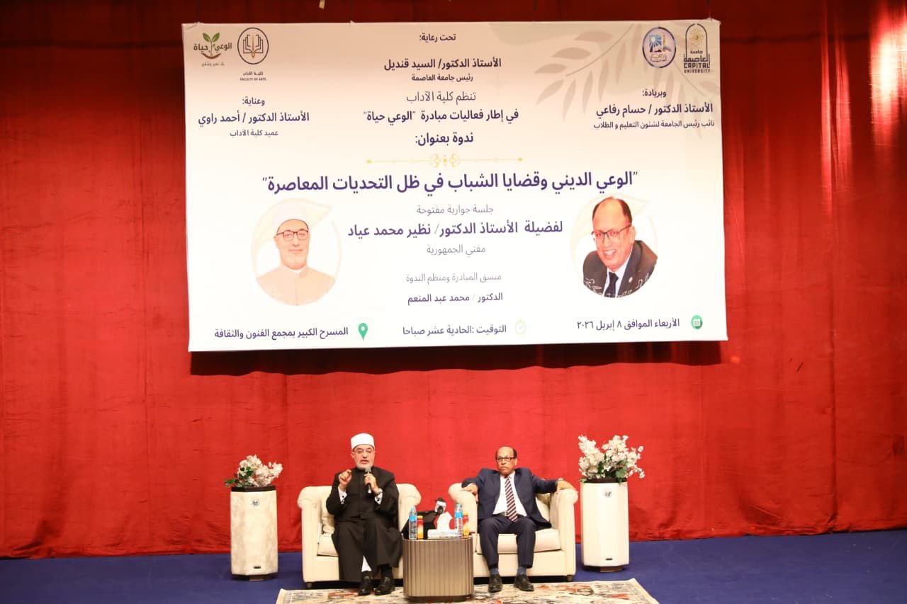 جاء ذلك خلال كلمته في ندوة بعنوان “الوعي الديني وقضايا الشباب في ظل التحديات المعاصرة” ضمن فعاليات مبادرة “الوعي حياة” التي نظمتها كلية الآداب بجامعة العاصمة “حلوان سابقًا” بالتعاون مع المؤشر العالمي للفتوى بدار الإفتاء المصرية، بحضور الأستاذ الدكتور السيد قنديل رئيس الجامعة، والأستاذ الدكتور حسام رفاعي نائب رئيس الجامعة لشئون التعليم والطلاب، والأستاذ الدكتور وليد السروجي نائب رئيس الجامعة لشئون خدمة المجتمع وتنمية البيئة، إلى جانب عدد من عمداء الكليات ووكلائها وأعضاء هيئة التدريس والطلاب.