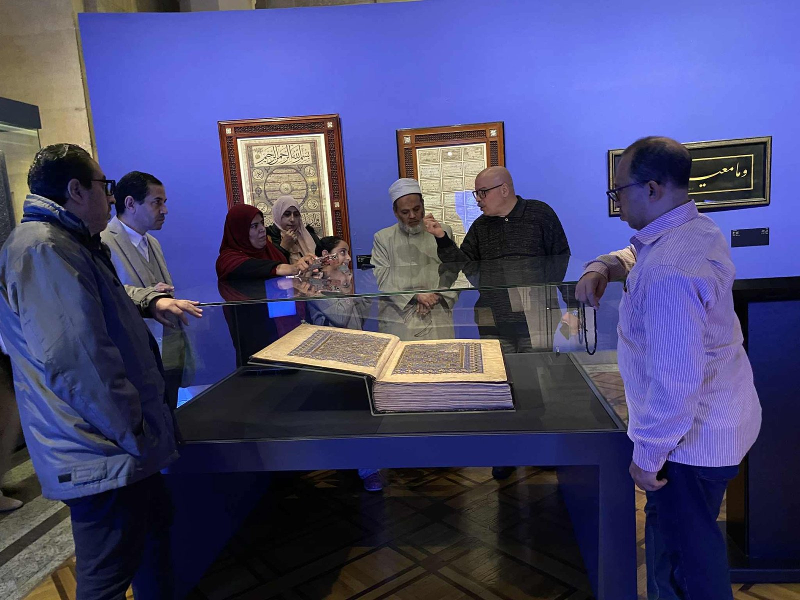 وابدي الوفد اهتمامًا بالغًا بقاعات العرض، التي تضم مجموعة متميزة من المصاحف المخطوطة، تتميز بجودة الخط وبراعة الزخرفة وجمال النقوش المحلاة بالذهب واللازورد. ومن بين أقدم هذه المصاحف مصحف كُتب خلال القرون الثلاثة الأولى للهجرة بخط كوفي على رق الغزال. كما تضم المجموعة مصحفًا كبير الحجم يُعرف باسم “مصحف الملك الناصر محمد بن سيف الدين قلاوون”، كُتب بماء الذهب ومُشَكَّل بالمداد الأسود بخط أحمد يوسف تركي عام 1243هـ، بقلم “ريحاني”، بالأضافة إلي تجليد من الفضة للمصحف الشريف صُنع في الهند خلال القرن الرابع عشر الهجري.