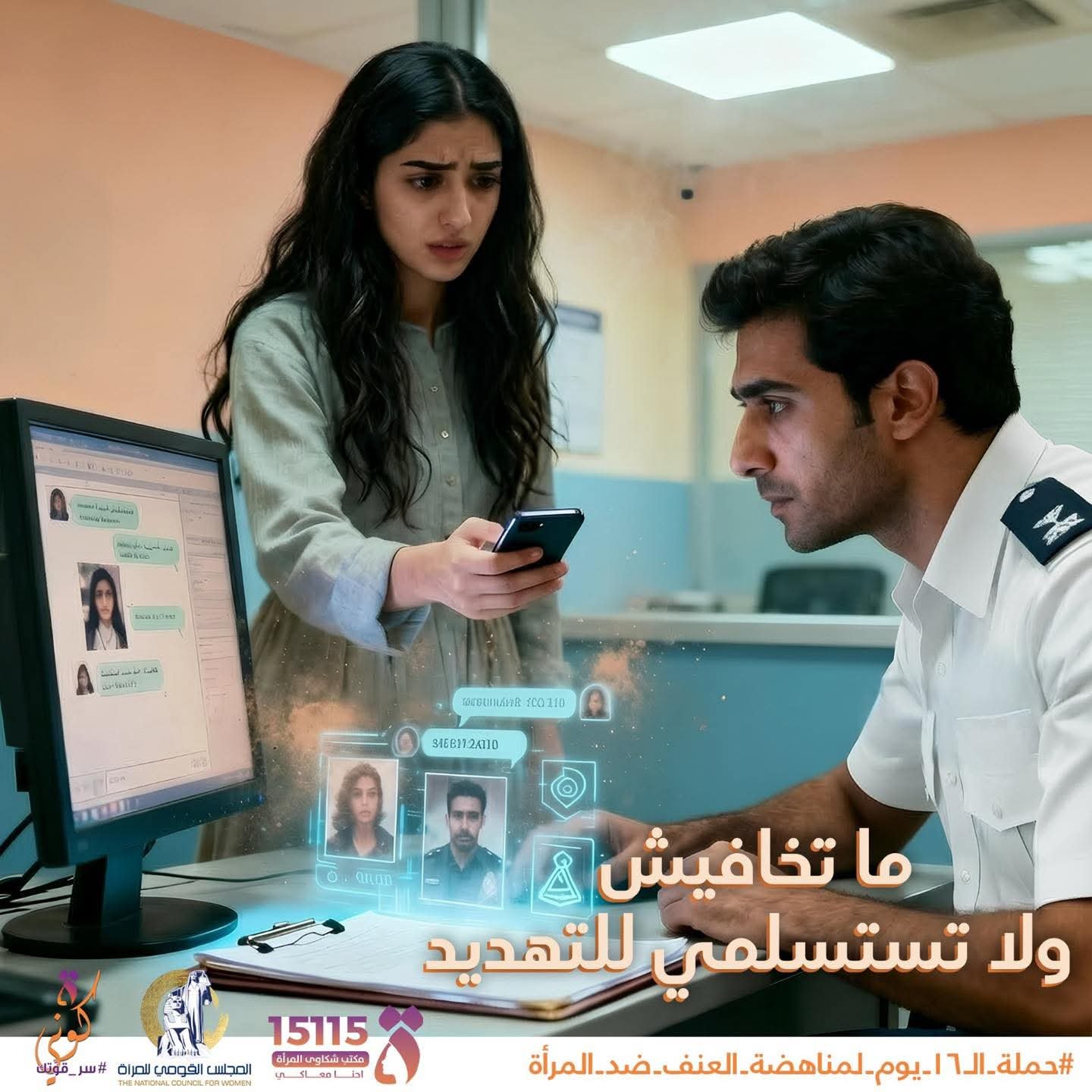 للإبلاغ عن أي جريمة إلكترونية أو تهديد رقمي، تقدري تتواصلي فورًا مع مباحث الانترنت ١٠٨
